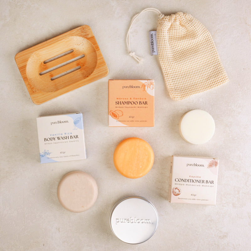 Το PureBloom Shower Routine Set αναβαθμίζει την φροντίδα σώματος και μαλλιών. Το σαμπουάν και το conditioner σε μορφή μπάρας, χωρίς SLS, parabens και σιλικόνες, ενυδατώνουν και δίνουν λάμψη, ιδανικά για κάθε τύπο μαλλιών, ενώ το αφρόλουτρο μπάρας κάνει την επιδερμίδα απαλή, με 100% vegan σύσταση. Απόλαυσε τες με όλα τα απαραίτητα αξεσουάρ!