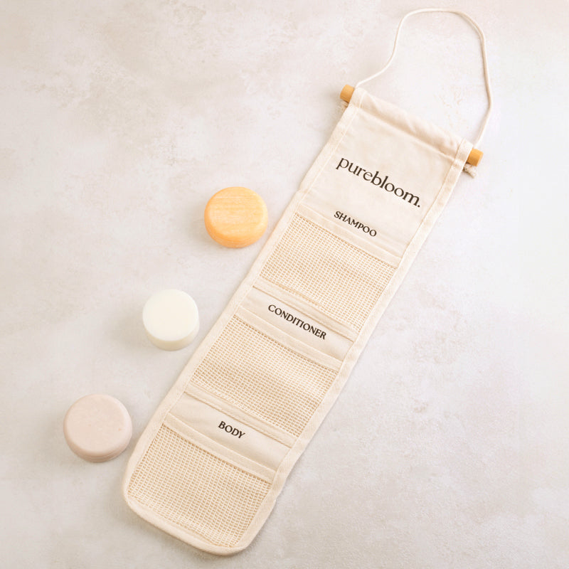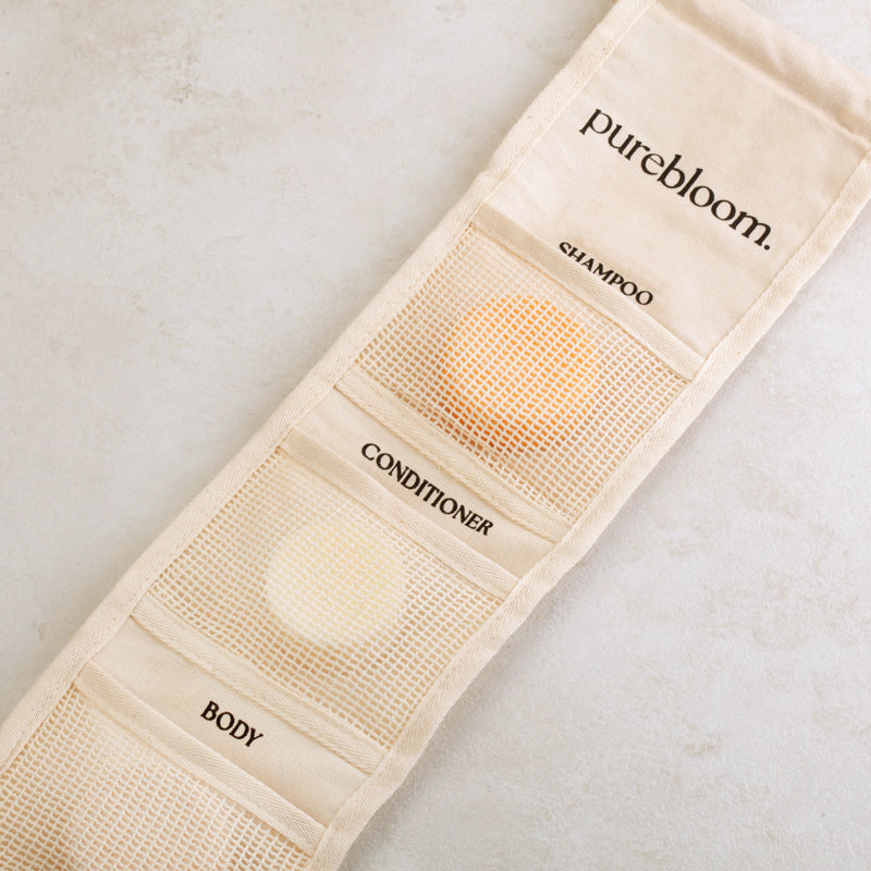 Βοηθά τις μπάρες να στεγνώνουν σωστά • Περιλαμβάνει 3 θέσεις για Shampoo, Conditioner & Body Bar • 100% βαμβάκι & μπαμπού, χωρίς πλαστικό